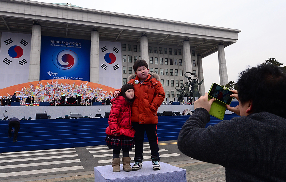 제18대 대통령 취임식이 열리는 25일 오전 서울 여의도 국회의사당 앞 취임식장을 찾은 시민들이 취임식이 시작하기 전 기념사진을 촬영하고 있다. 노진환 기자 myfixer@