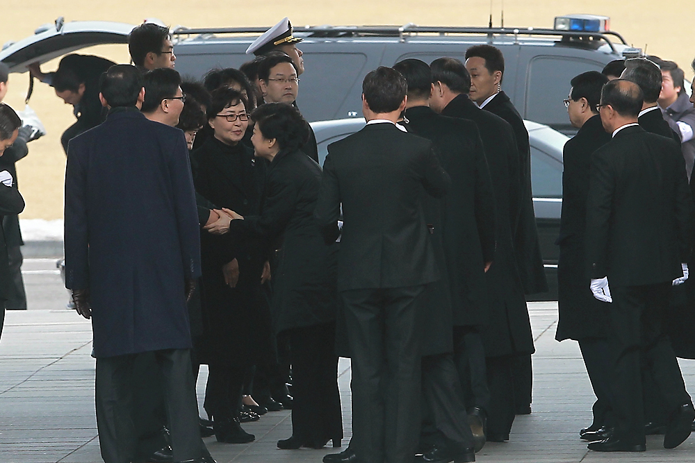 취임식을 앞두고 있는 박근혜 대통령이 정부대표를 비롯해 국가유공자 및 현충원 안장 유가족 등과 함께 25일 오전 서울 동작구 국립현충원을 찾아 참배 전 참석자들과 인사나누고 있다.