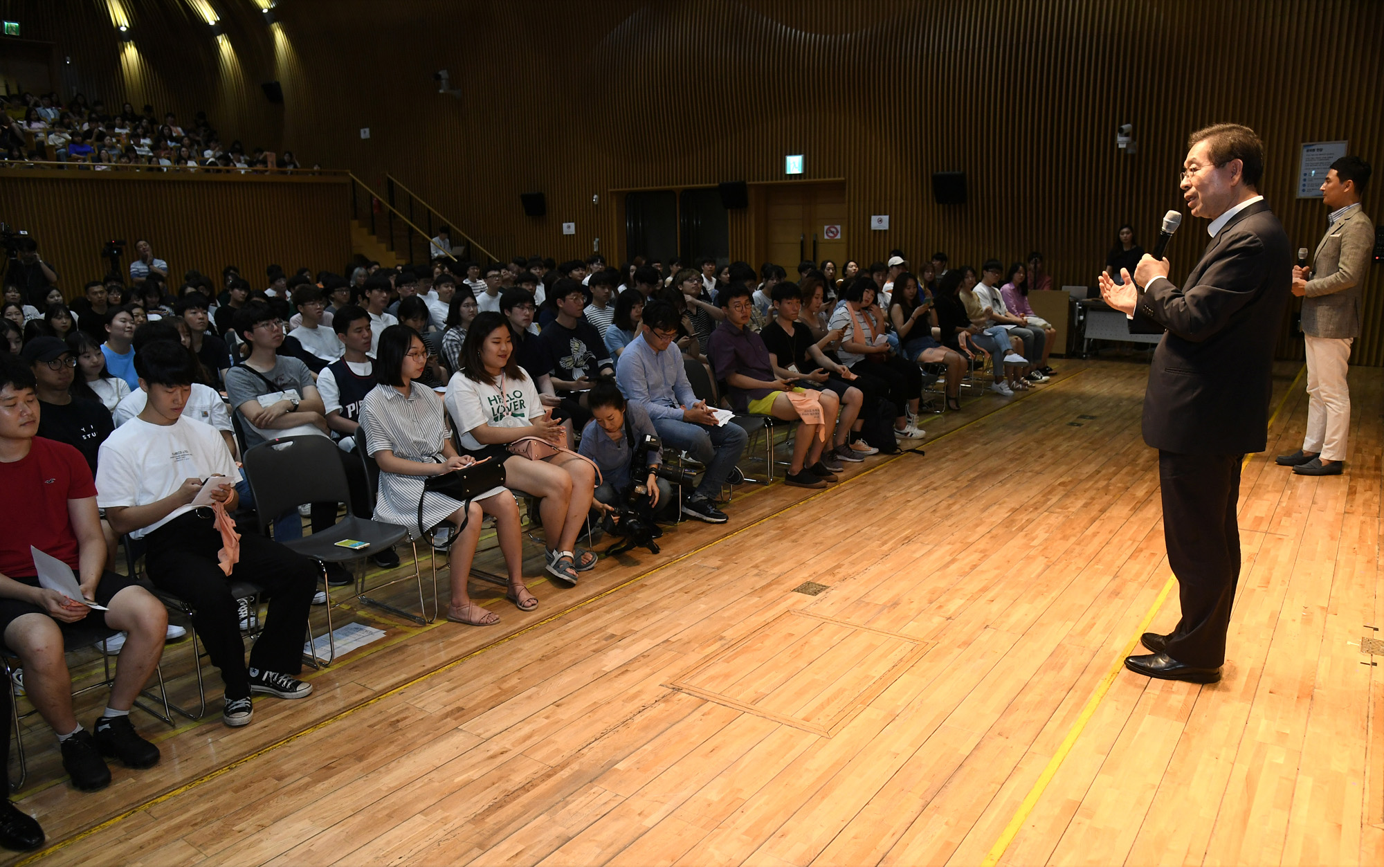 박원순 서울시장이 27일 오후 서울시청 다목적홀에서 열린 '여름방학 대학생 아르바이트 어울림 한마당' 행사에 참석해 학생들에게 인사를 하고 있다. 서울시 제공