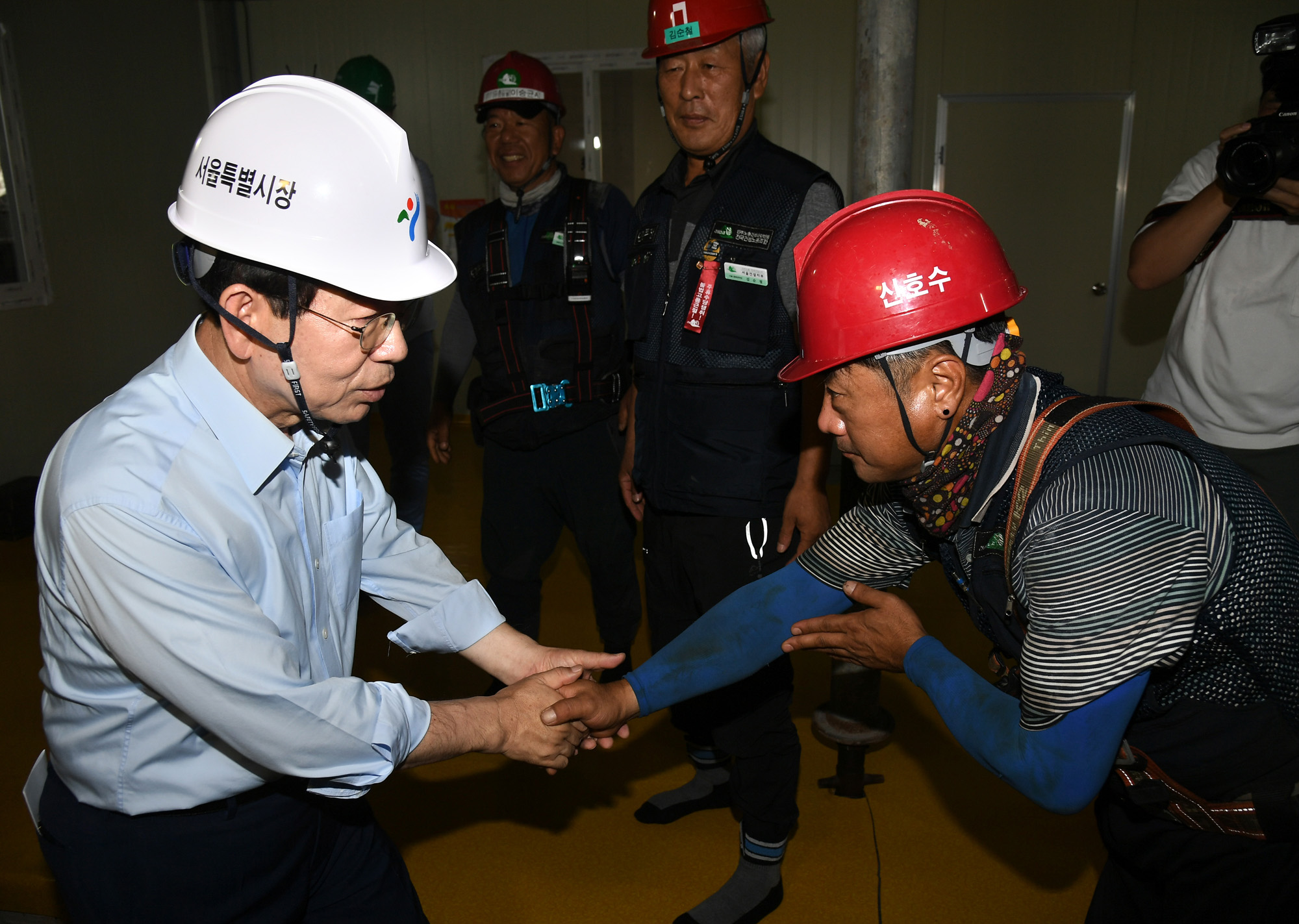 박원순 서울시장이 30일 서울 미아 9-1구역 주택재건축사업 현장을 방문, 무더위 쉼터에서 휴식 중인 노동자들과 대화를 나누고 있다. 서울시 제공
