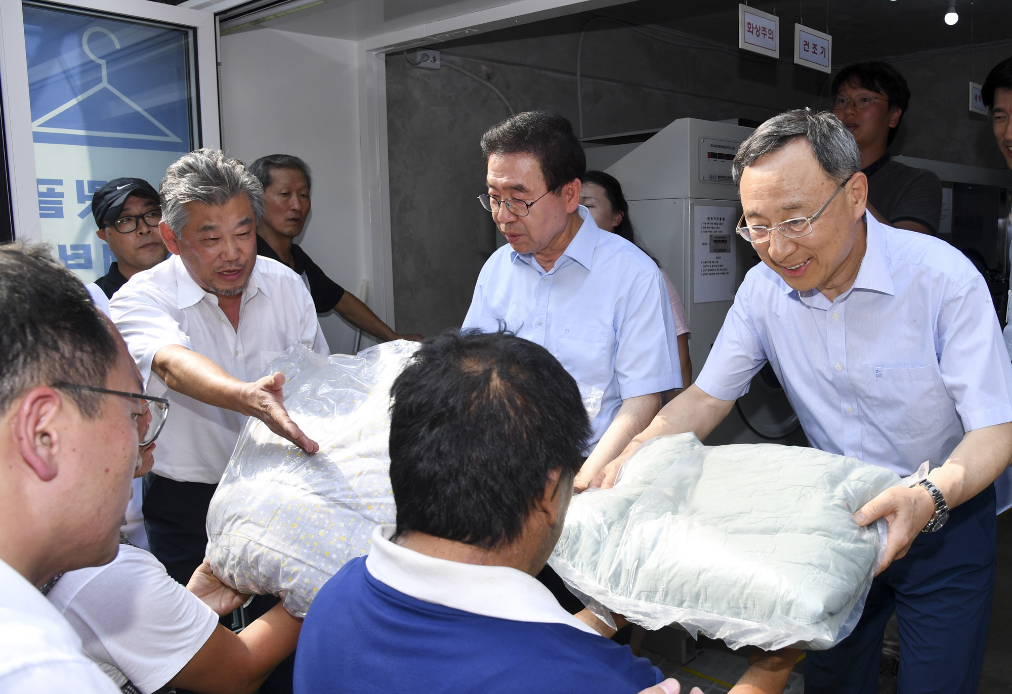 박원순 서울시장과 황창규 KT 회장이 7일 오후 서울 동자동 새꿈어린이공원을 찾아 돌다릿골 빨래터 제막식에 참석하고 있다. 서울시 제공