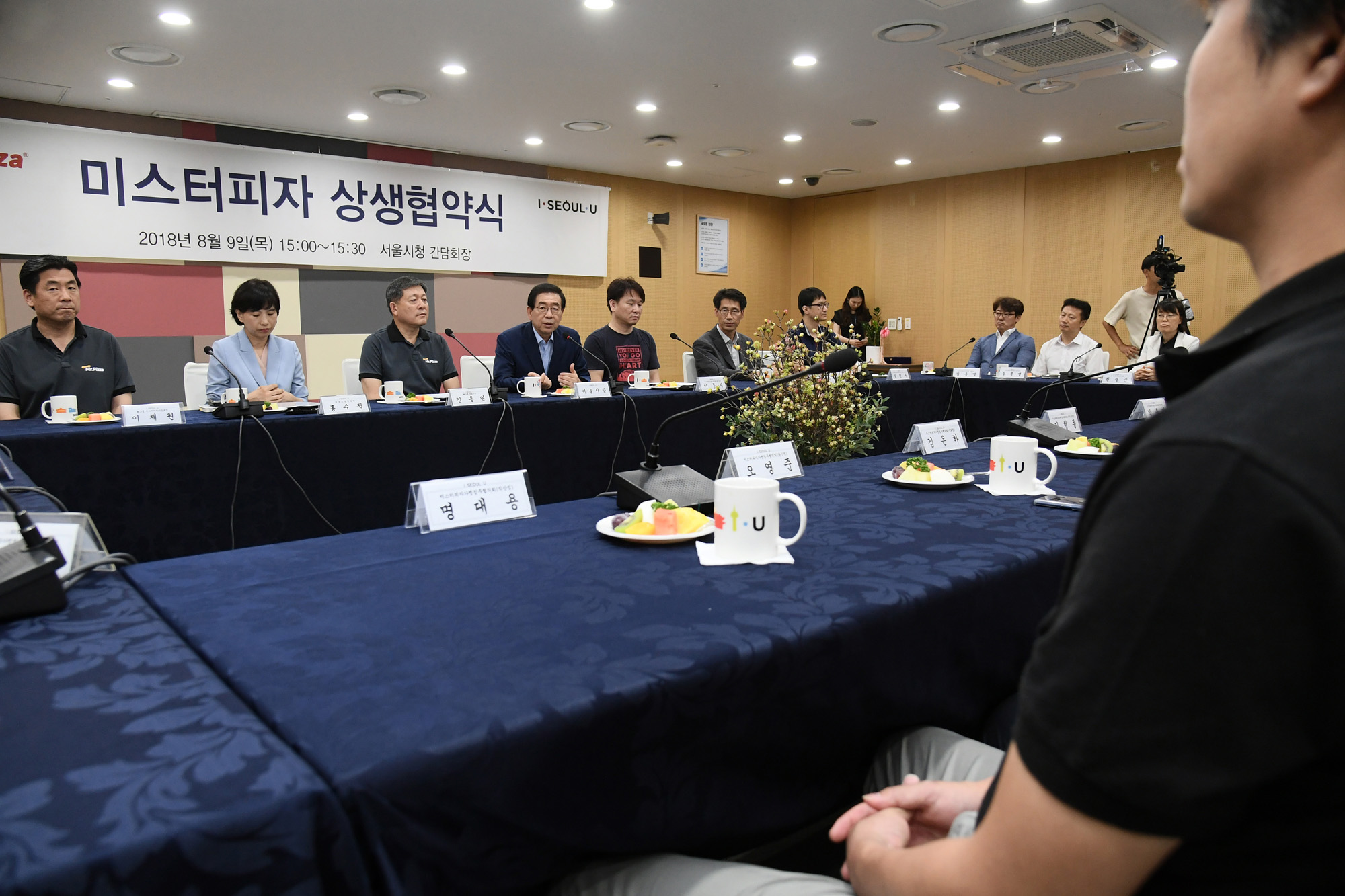 박원순 서울시장이 9일 오후 서울 중구 서울시청신청사에서 열린 미스터피자 상생협약식에 참석해 모두발언을 하고 있다. 서울시 제공