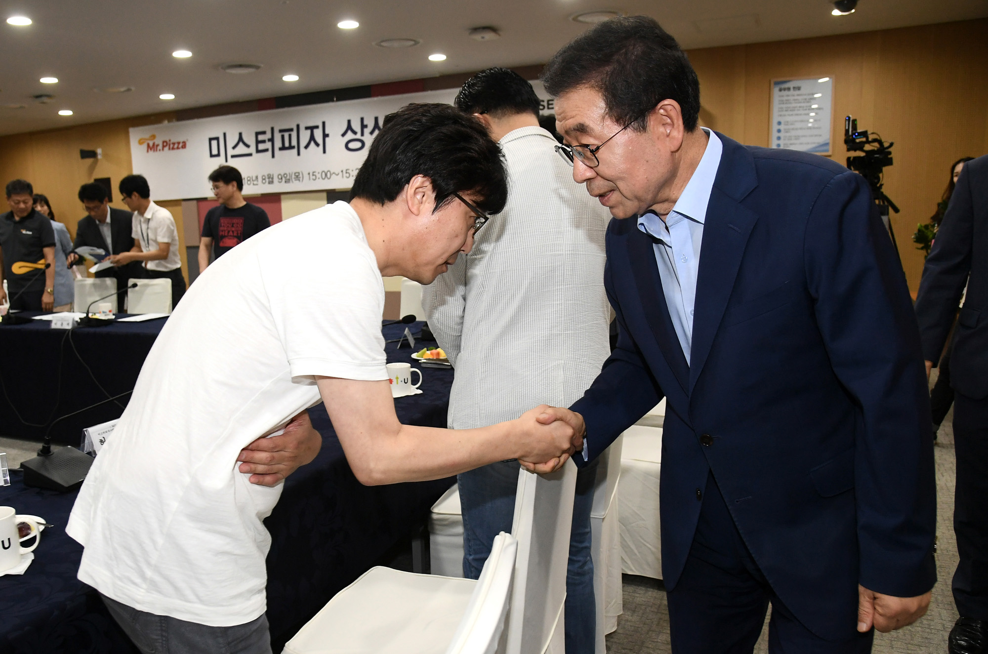 박원순 서울시장이 9일 오후 서울 중구 서울시청신청사에서 열린 미스터피자 상생협약식에 참석해 모두발언을 하고 있다. 서울시 제공