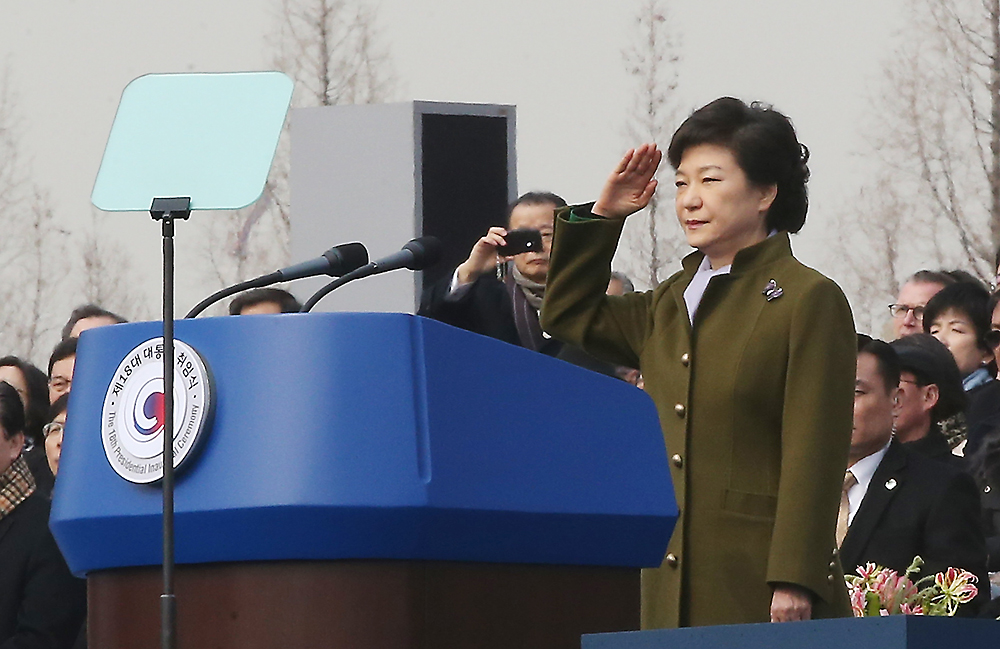 박근혜 대통령이 25일 서울 여의도 국회의사당 광장에서 열린 제18대 대통령 취임식에서 의장대 사열을 받으며 거수경례를 하고 있다. 2013.2.25/뉴스1