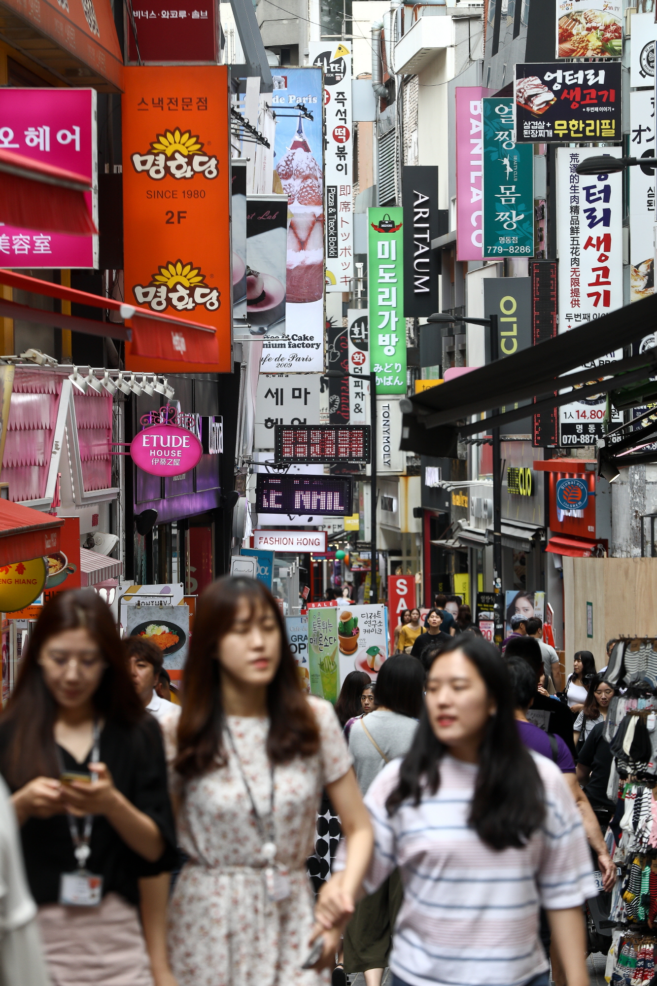 [서울=eoimage] 시사저널 고성준 기자 = 21일 오후 서울 중구 명동 자영업 사업장이 있는 거리 전경. 2018.8.21