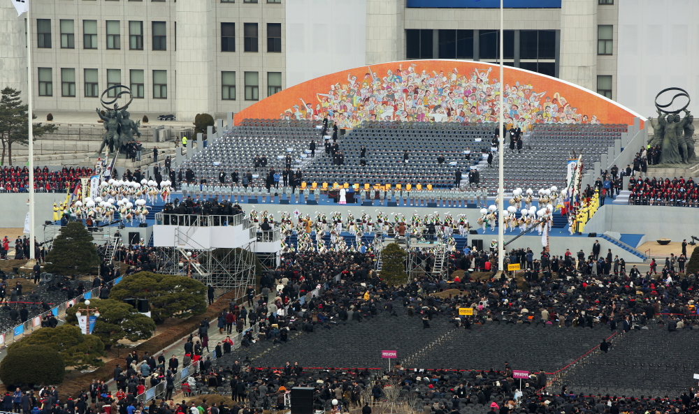 제 18대 대통령 취임식이 열리는 25일 오전 서울 국회의사당 광장에서 시민들이 사전 축하공연을 보고 있다. 13.02.25. 시사저널 최준필