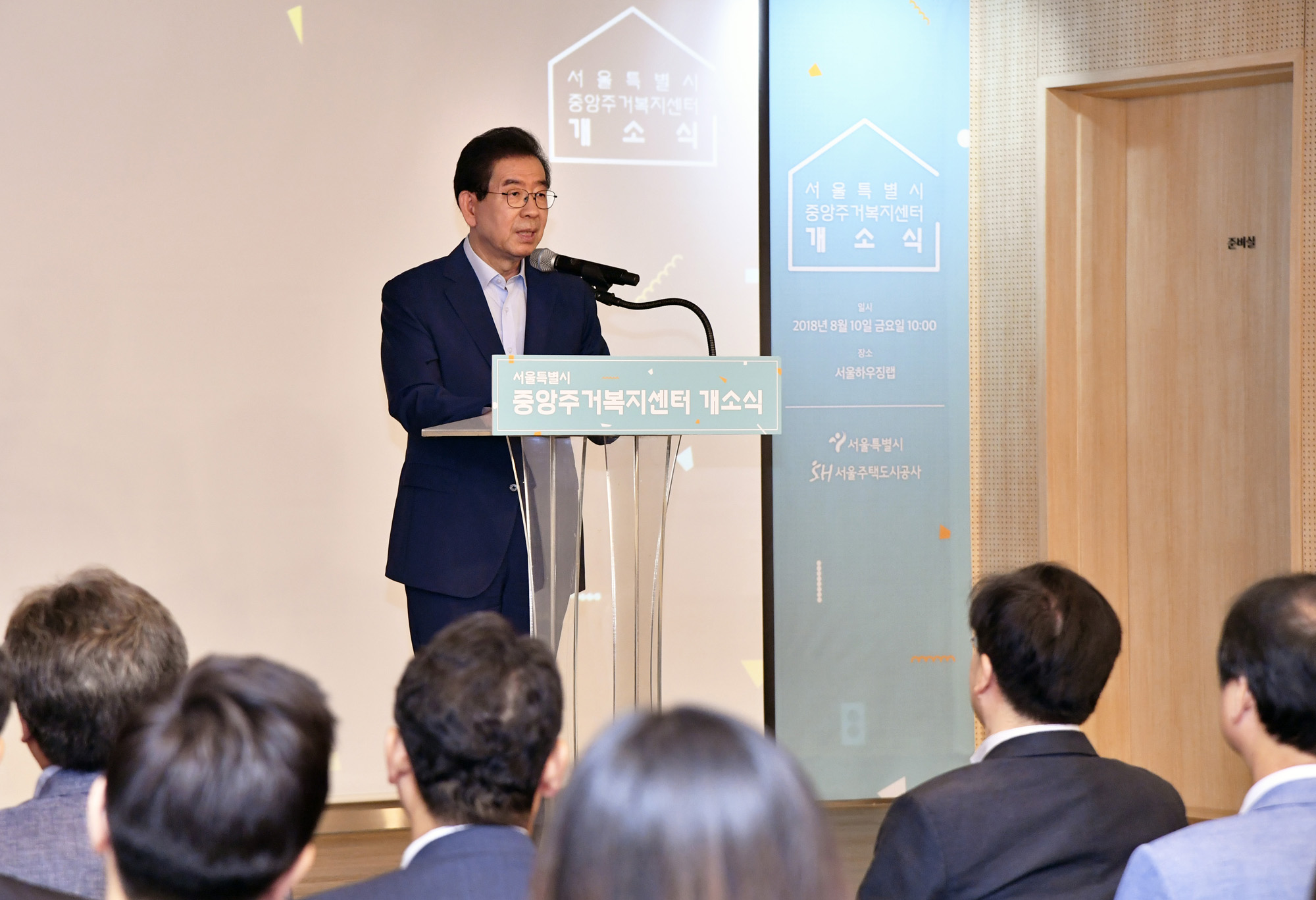 박원순 서울시장이 10일 서울 영등포구 서울하우징랩에서 열린 ‘서울시 중앙주거복지센터 개소식’에서 인사말을 하고 있다. 서울시 제공