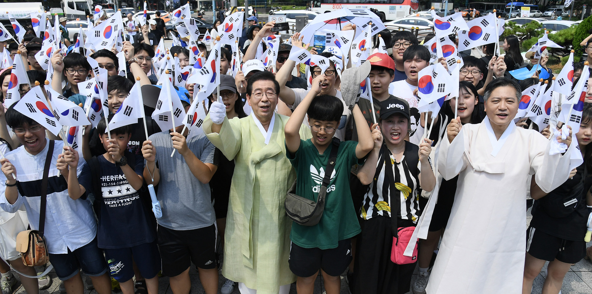 광복절인 15일 정오 서울 종로구 보신각에서 열린 '73주년 광복절 기념 타종식'에서 박원순 서울시장(앞줄 왼쪽) 등 내빈들이 타종행사를 하고 있다. 서울시 제공
