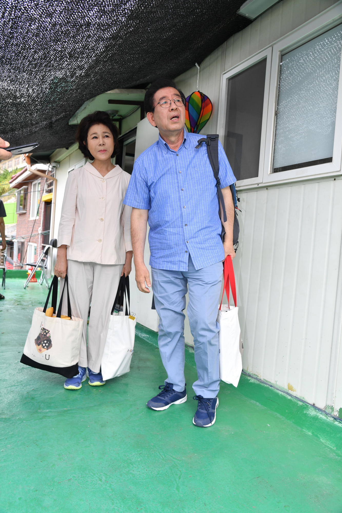 옥탑방에서 강북 '한 달 살이'를 마친 박원순 서울시장이 19일 오전 강북구 삼양동 옥탑방을 나서며 주민들과 인사를 하고 있다. 서울시 제공