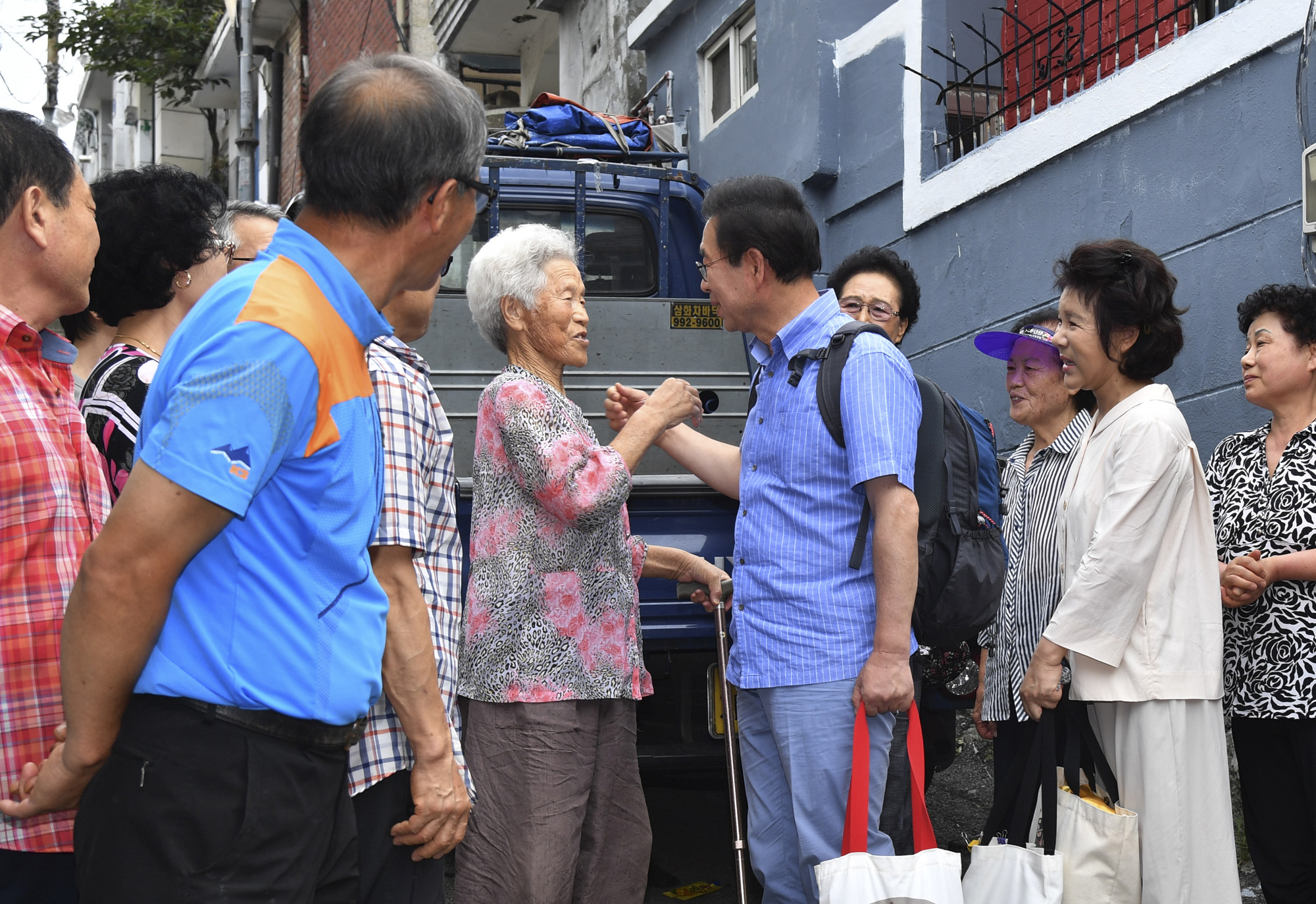 옥탑방에서 강북 '한 달 살이'를 마친 박원순 서울시장이 19일 오전 강북구 삼양동 옥탑방을 나서며 주민들과 인사를 하고 있다. 서울시 제공
