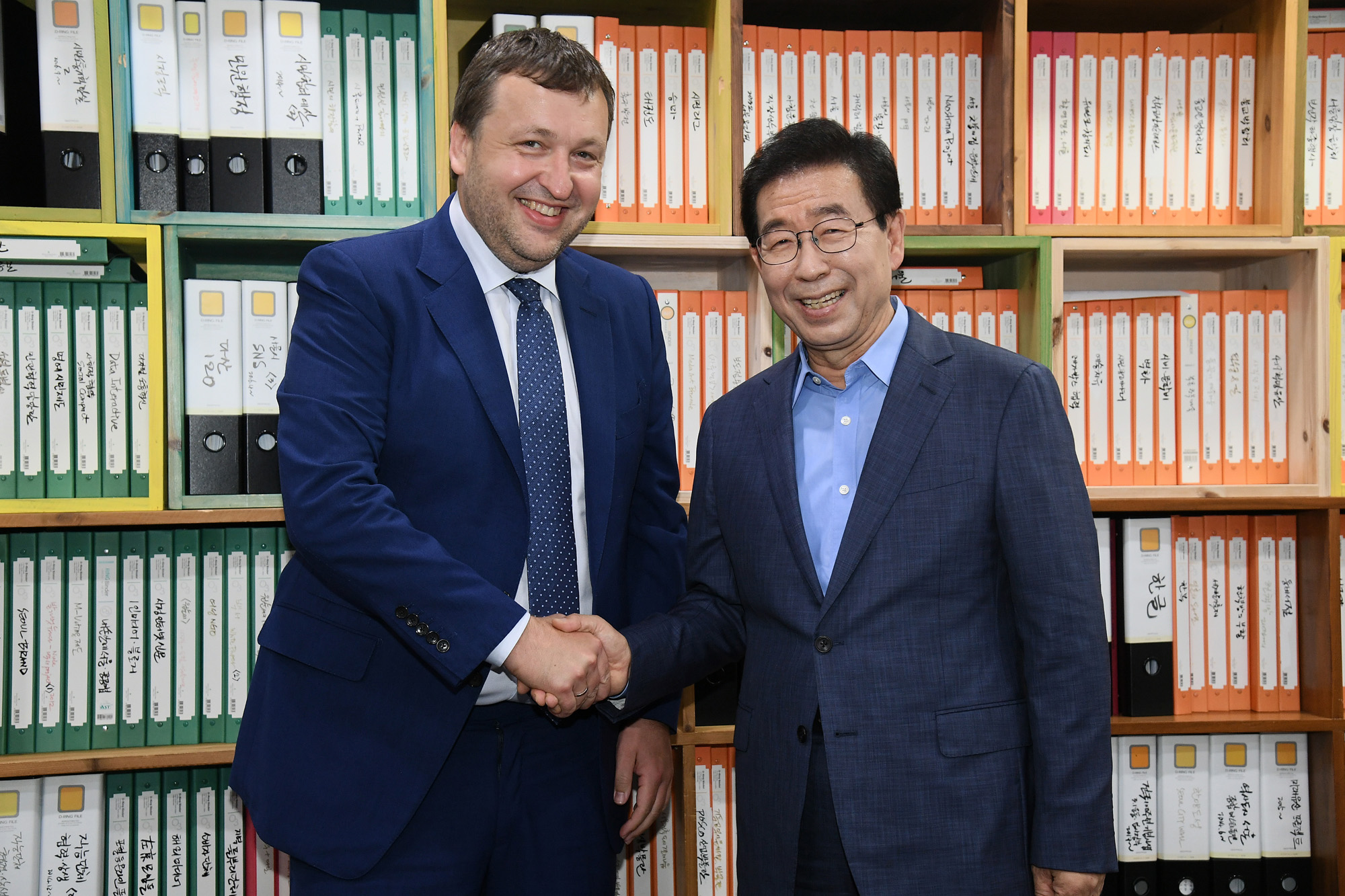 박원순 서울시장이 22일 오후 서울시청을 방문한 리투아니아의 안타나스 구오가 유럽연합 의회 의원과 면담하고 있다. 서울시 제공