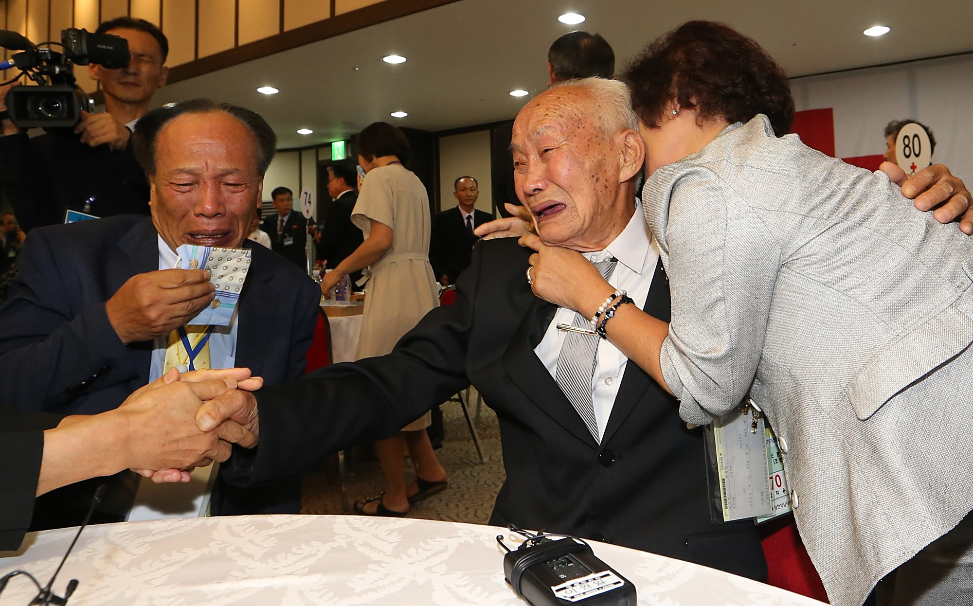 제21차 이산가족 상봉행사 2회차 첫날인 24일 오후 금강산 이산가족면회소에서 열린 단체상봉에서 남측의 조정기(67.왼쪽)씨가 북측의 아버지 조덕용(88)을 만나 눈물을 흘리고 있다. 오른쪽은 남측 동생 조분화 (조분라,72) /20180824 금강산=사진공동취재단 /뉴스웨이 이수길