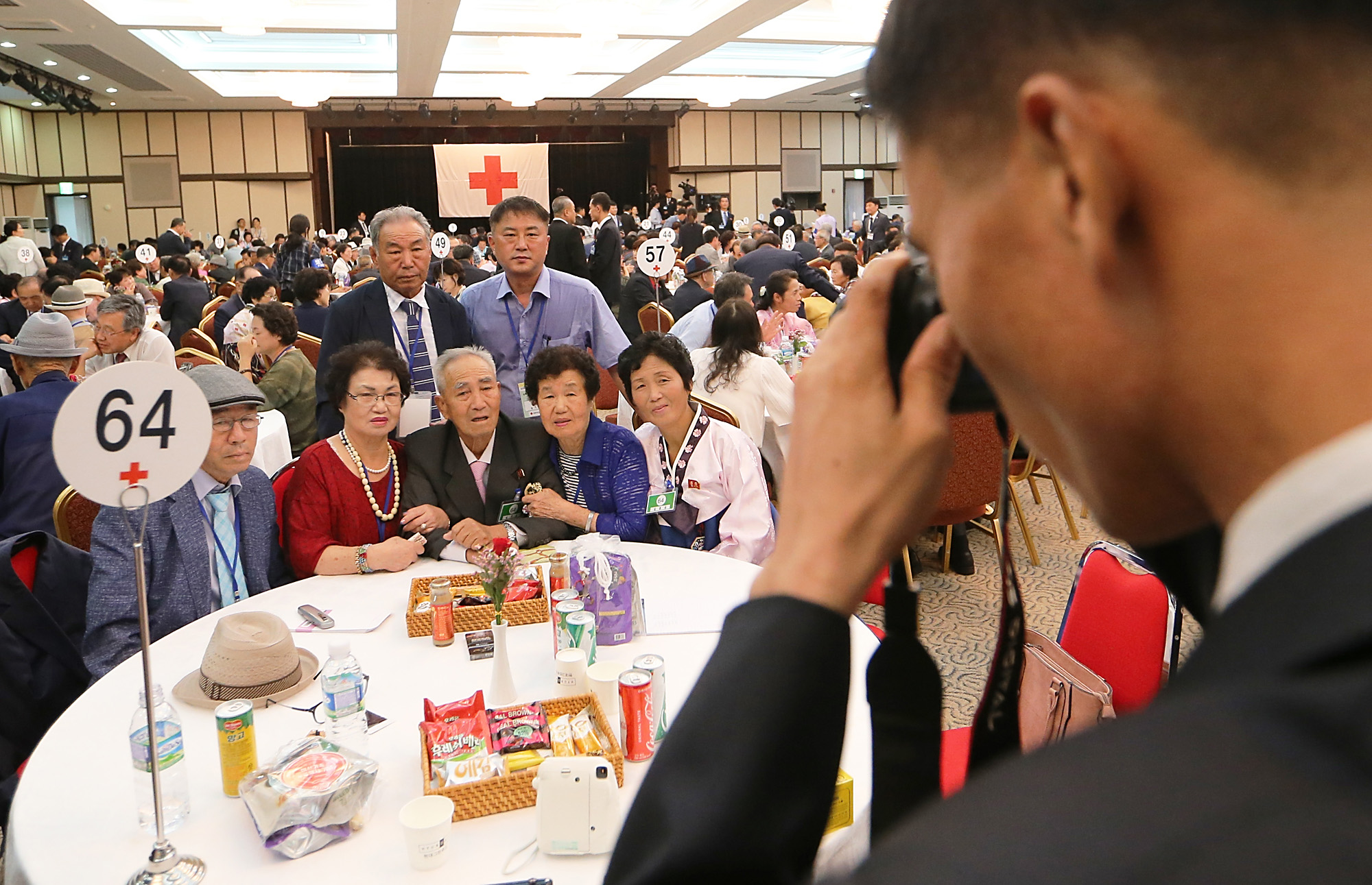 제21차 남북 이산가족 상봉행사 2회차 첫날인 24일 오후 금강산 면회소에서 열린 단체상봉에서 북측 임기산(87)할아버지와 딸 임춘선(52)씨가 남측에 동생들과 기념촬영을 하고 있다. /20180824 금강산=사진공동취재단 /뉴스웨이 이수길