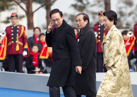 이명박 대통령 내이가 25일 서울 영등포구 여의도동 국회의사당에서 열린 18대 대통령 취임식에 입장하고 있다. 2013.02.25 사진 임준선 기자