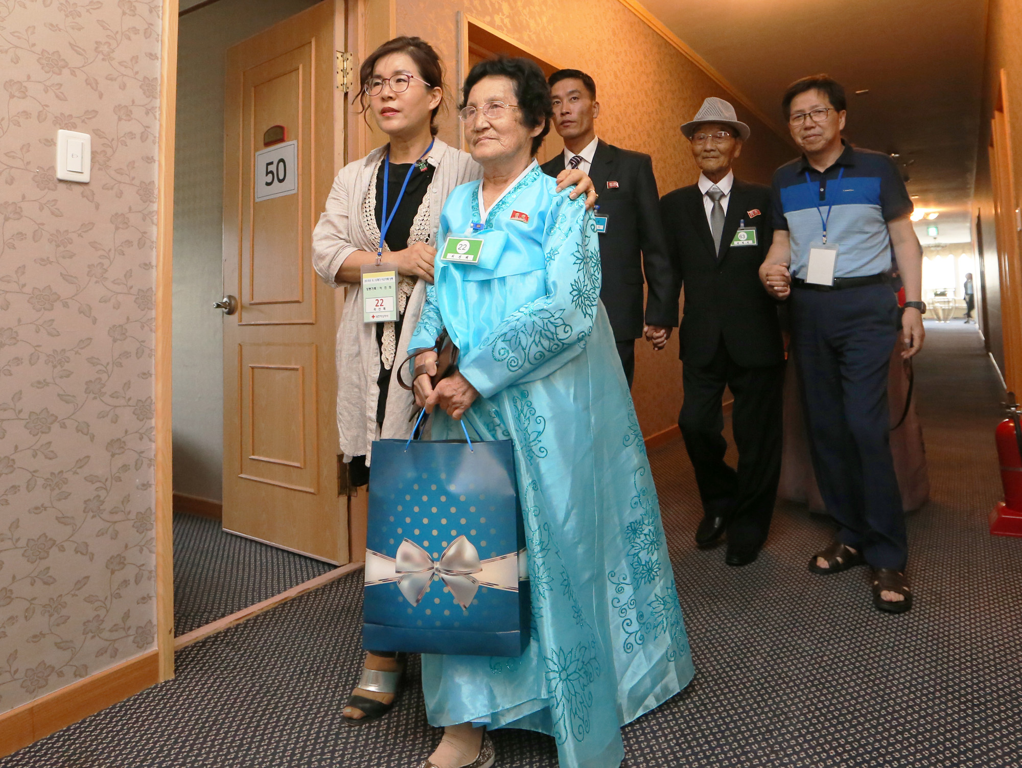 제21차 남북 이산가족 2차 상봉행사 둘째 날인 25일 오전 금강산호텔에 도착한 북측 리선례(81) 할머니가 개별상봉을 위해 남측 조카와 질부가 기다리는 방으로 이동하고 있다./20180824 사진(금강산)=사진공동취재단 /뉴스웨이 이수길