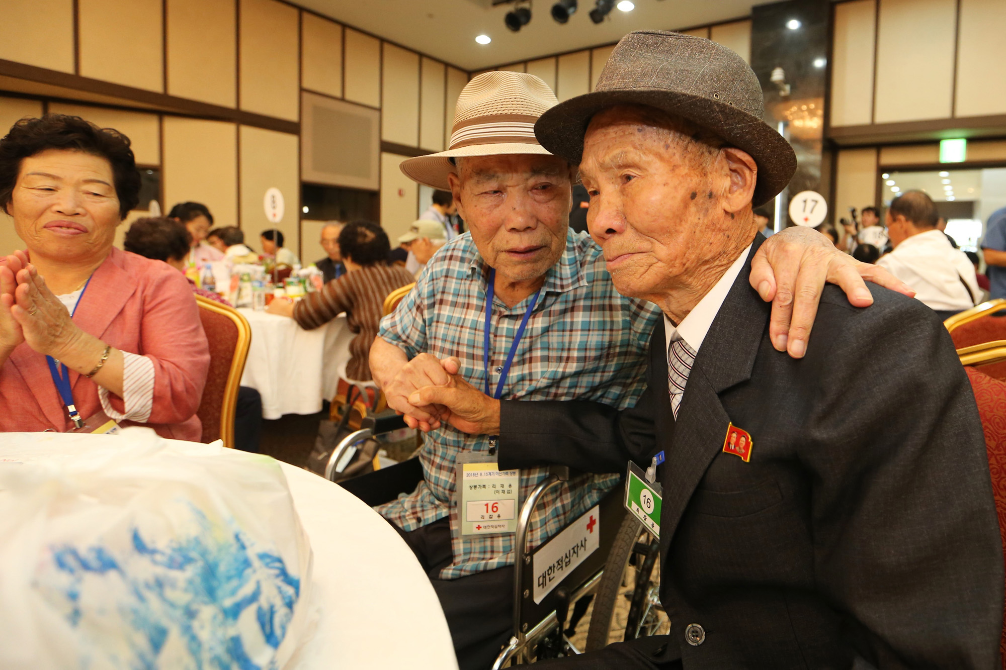 제21차 남북 이산가족 2회차 상봉행사 둘째 날인 25일 오후 북한 금강산 이산가족면회소에서 열린 단체상봉에서 남측 동생 리재용(이재섭,80)이 북측 형 리갑용(83)의 손을 잡으며 대화하고 있다.