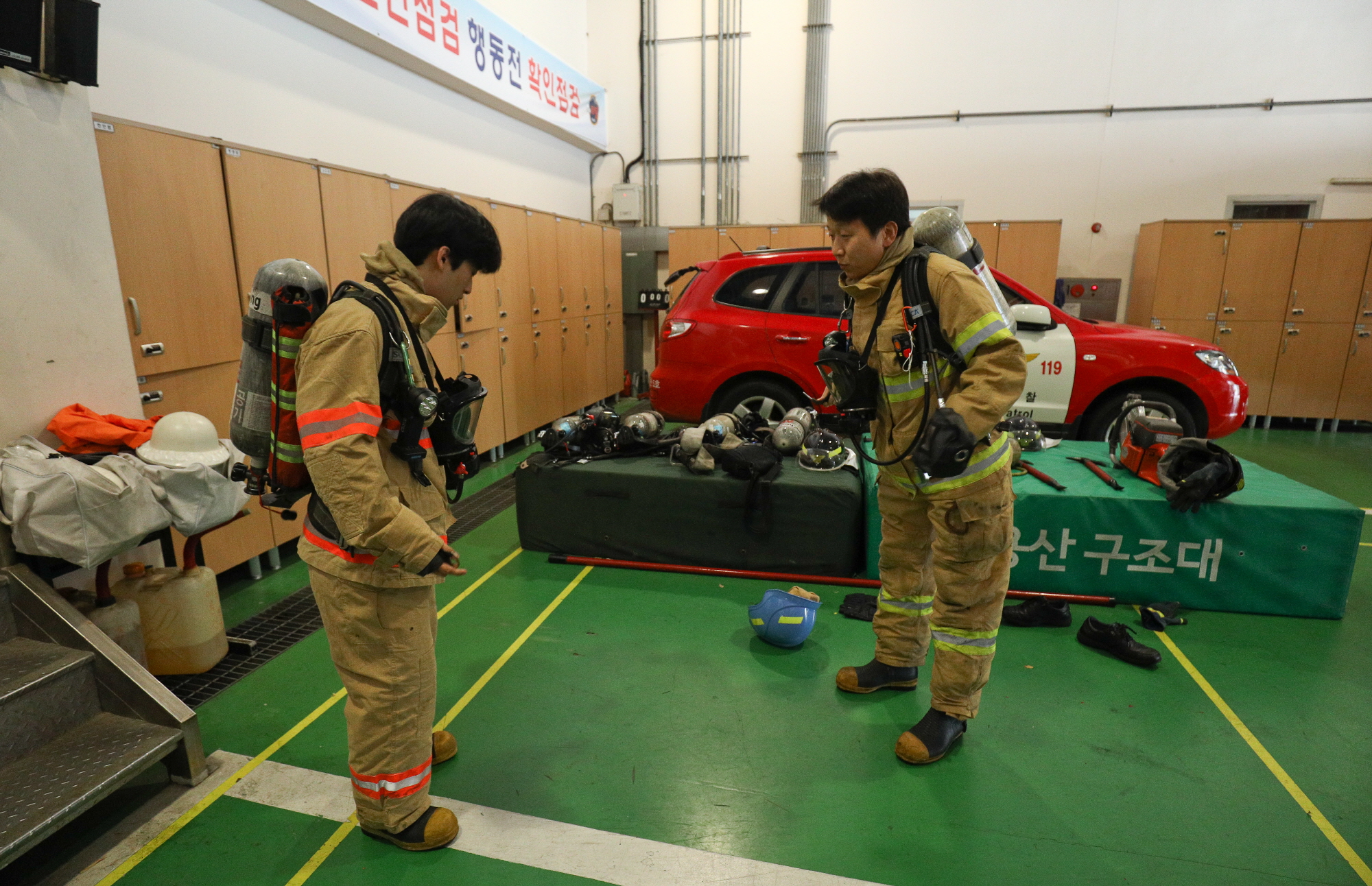 [서울=eoimage] 고성준 기자 = 28일 오전 서울 용산소방서에서 본지 기자가 방화복을 입고 있다. 2018.8.28