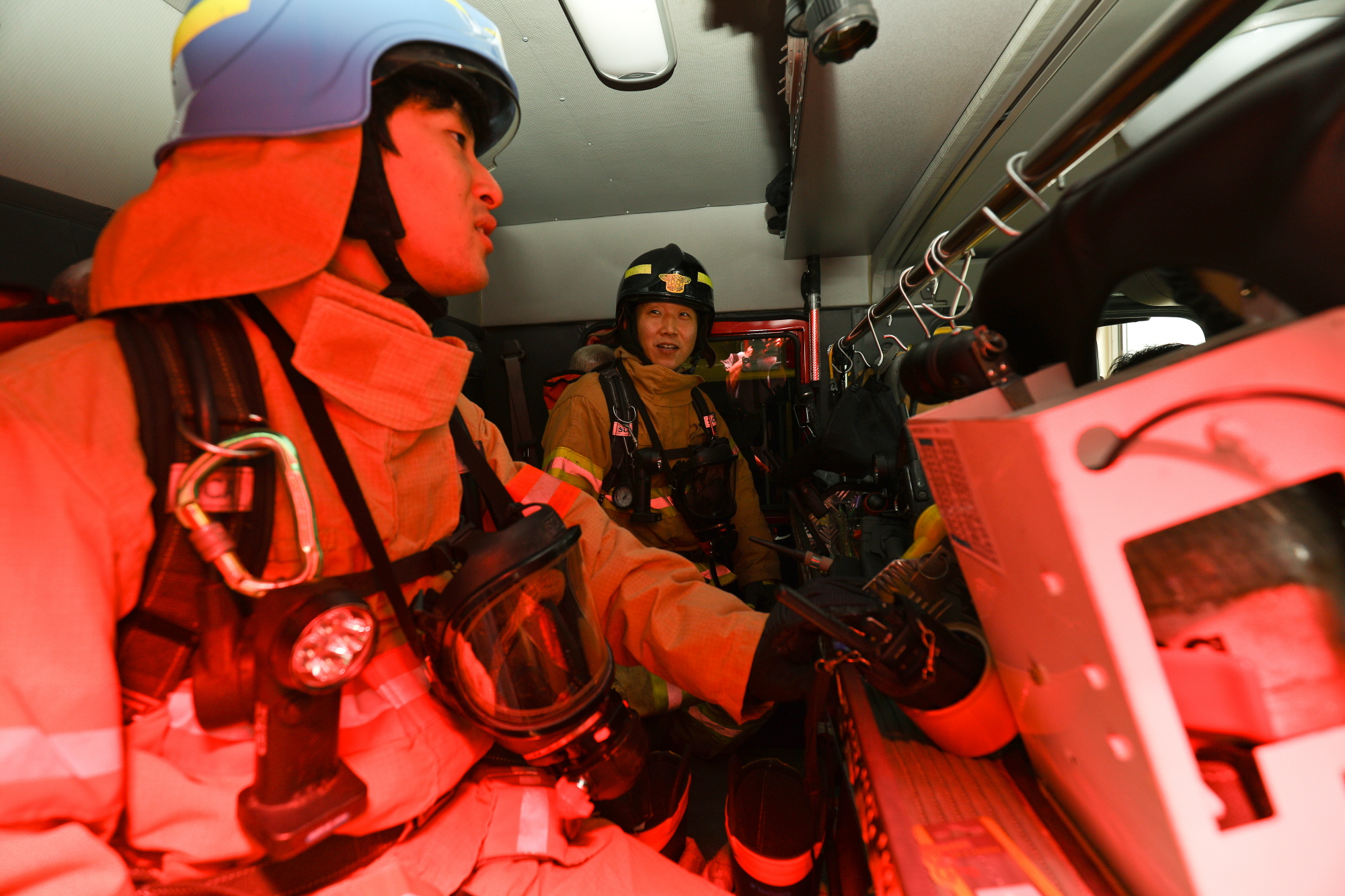 [서울=eoimage] 고성준 기자 = 28일 오전 서울 용산소방서에서 본지 기자가 소방대원의 설명을 듣고있다. 2018.8.28