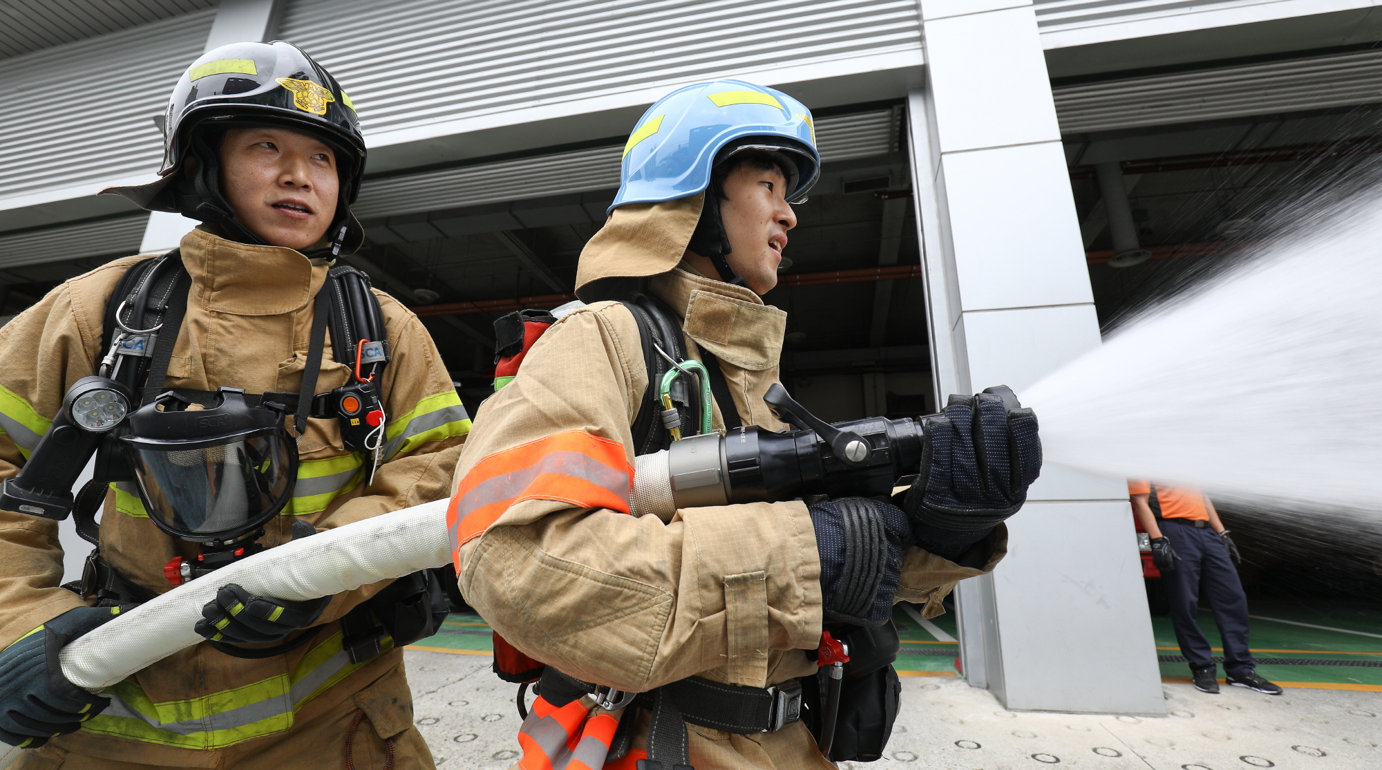 [서울=eoimage] 고성준 기자 = 28일 오전 서울 용산소방서에서 살수 훈련을 하고있다. 2018.8.28