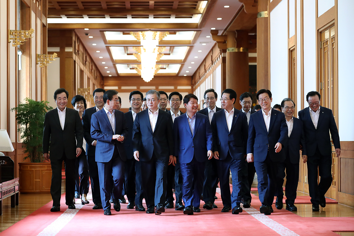 문재인 대통령이 30일 청와대 본관 충무실에서 열린 민선7기 시·도지사 간담회에 참석자들과 함께 입장하고 있다.