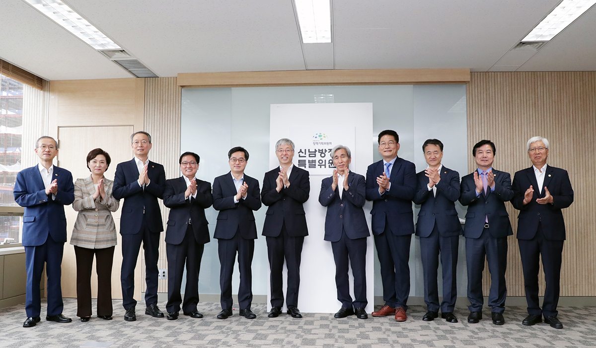 김현철 신남방정책 특별위원장이 28일 오전 서울 광화문 오피시아빌딩에서 열린 '신남방정책특별위원회 현판식'에서 참석자들과 현판을 제막 후 박수치고 있다. 왼쪽부터 임성남 외교부 1차관, 김현미 국토교통부 장관, 백운규 산업통상자원부 장관, 유영민 과학기술정보통신부 장관, 김동연 경제부총리 겸 기획재정부 장관, 김 위원장, 정해구 대통령 직속 정책기획위원회 위원장, 송영길 더불어민주당 의원, 박능후 보건복지부 장관, 홍종학 중소벤처기업부 장관, 전제국 방사청장. 2018.08.28 사진 청와대제공 |
