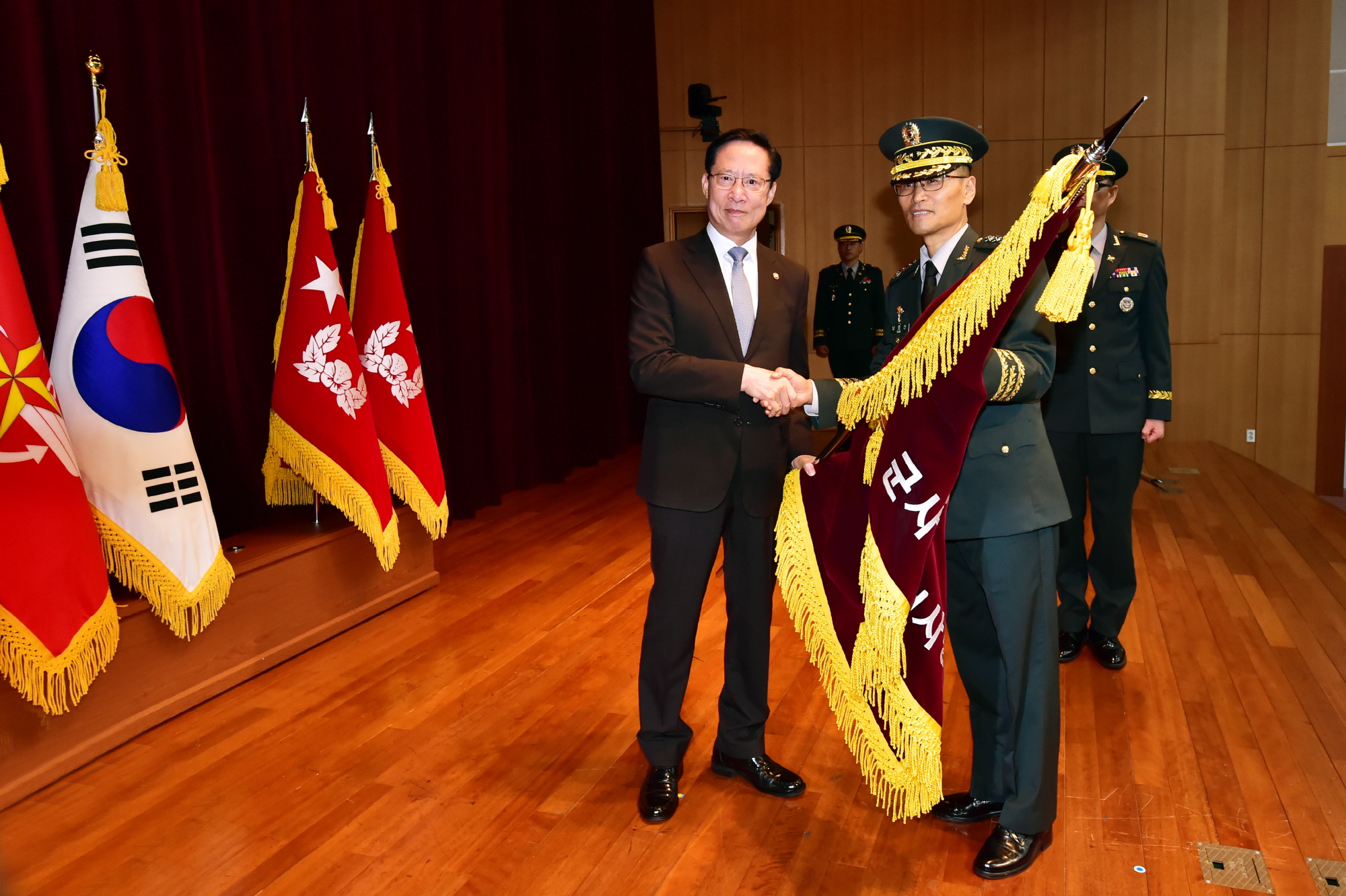 국방부는 계엄 문건 파문을 일으킨 국군기무사령부를 대체 할 새로운 군 정보부대 '군사안보지원사령부'의 창설식을 1일 경기도 과천 군사안보지원사령부(구 기무사령부) 청사에서 거행한 가운데 송영무 국방부 장관이 남영신 초대 안보지원사령관에게 부대기를 전달하고 있다. 새로 창설된 군사안보지원사령부(이하 안보지원사)는 국방부 직할부대로 기존 기무사 인력 4200여명 중 원대복귀 등을 제외한 2900명 규모로 운영되며, 앞으로 군 정보부대 본연의 임무인 보안·방첩 등에 중점을 둬 업무에 집중할 것으로 보여진다. 2018.9.1 |