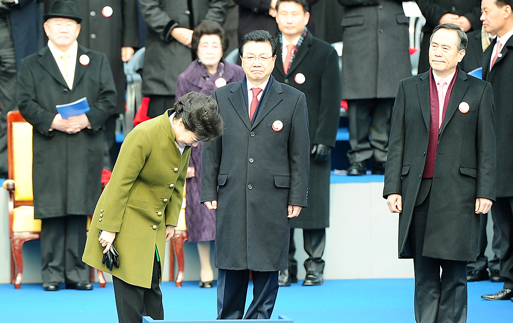 박근혜 대통령이 25일 오전 국회에서 열린 제18대 대통령 취임식에 입장하며 국민들에게 고개숙여 인사를 하고 있다./이병화 기자photolbh@
