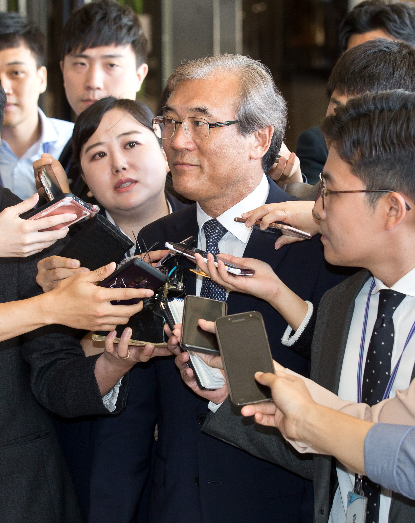 [서울=eoimage] (이오이미지) 임준선기자 = 이민걸 전 법원행정처 기획조정실장이 12일 오전 서울 서초구 서울중앙지검에서 양승태 사법부의 사법농단 의혹과 관련해 조사를 받기 위해 출석해 취재진의 질문을 받고 있다. 2018.09.12