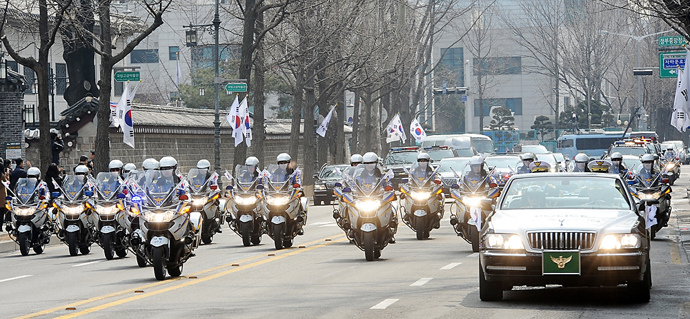 서울 광화문 광장에서 열린 복주머니 개봉행사를 마친 박근혜 제18대 대통령을 태운 차량 행렬이 청와대 분수대를 향하고 있다.