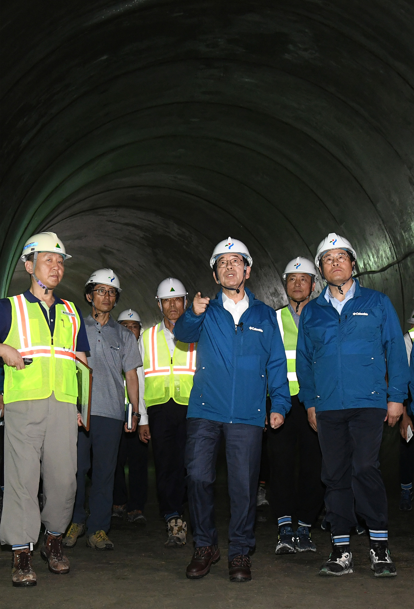 초강력 태풍 '솔릭'의 상륙을 앞둔 23일 서울 양천구 신월 빗물저류 배수시설 공사 현장에서 박원순 서울시장이 공사 관계자들과 함께 시설 상황을 점검하고 있다. 서울시 제공