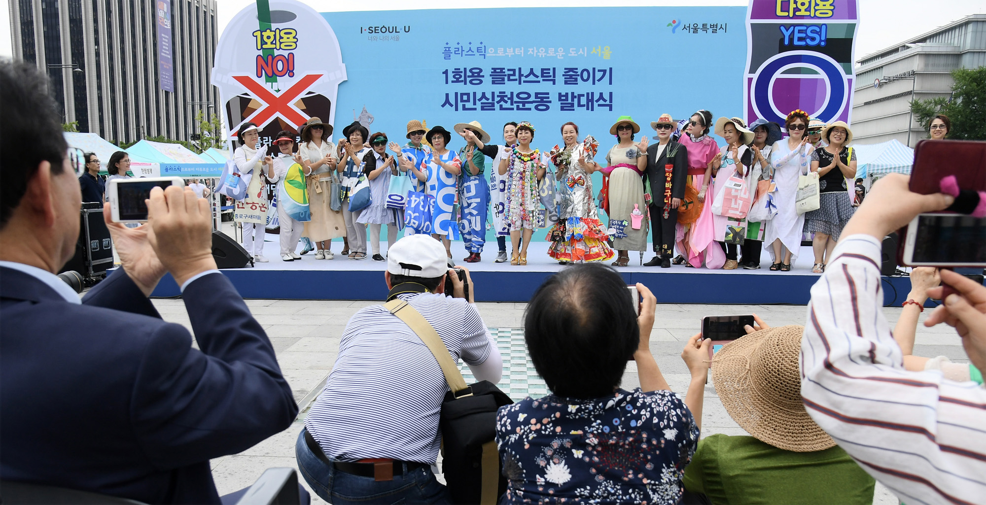 26일 서울 광화문 광장에서 열린 일회용 플라스틱 줄이기 시민실천운동 발대식에서 박원순 서울시장(왼쪽 네번째)을 비롯한 참석자들이 한사람이 사용하는 일회용컵 사용량 500개를 버리는 퍼포먼스를 하고 있다. 서울시 제공