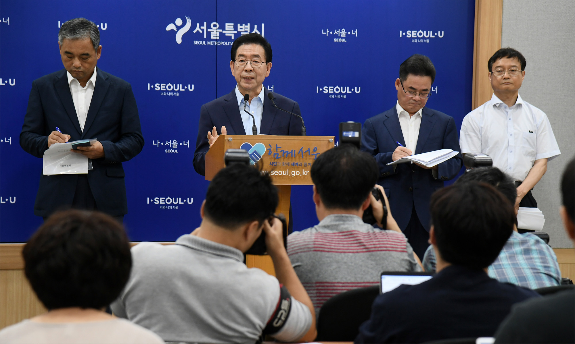 26일 오후 서울시청에서 박원순 시장이 여의도, 용산 마스터플랜을 보류한다는 기자회견을 하고 있다. 서울시 제공