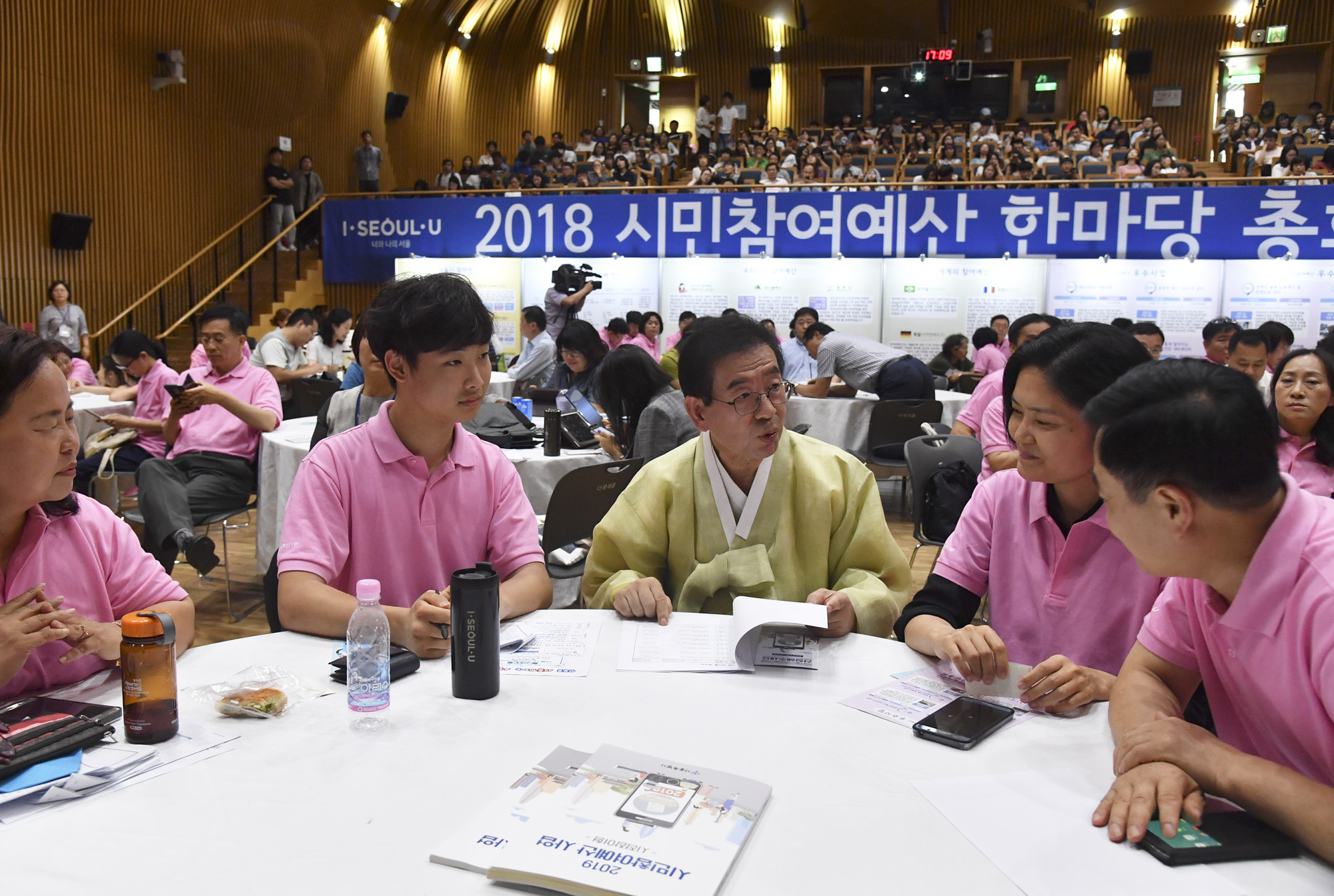 박원순 서울시장은 1일 신청사 8층 다목적홀에서 열리는 '2018 시민참여예산 한마당 총회' 현장을 찾아 시민들을 격려하고 있다.