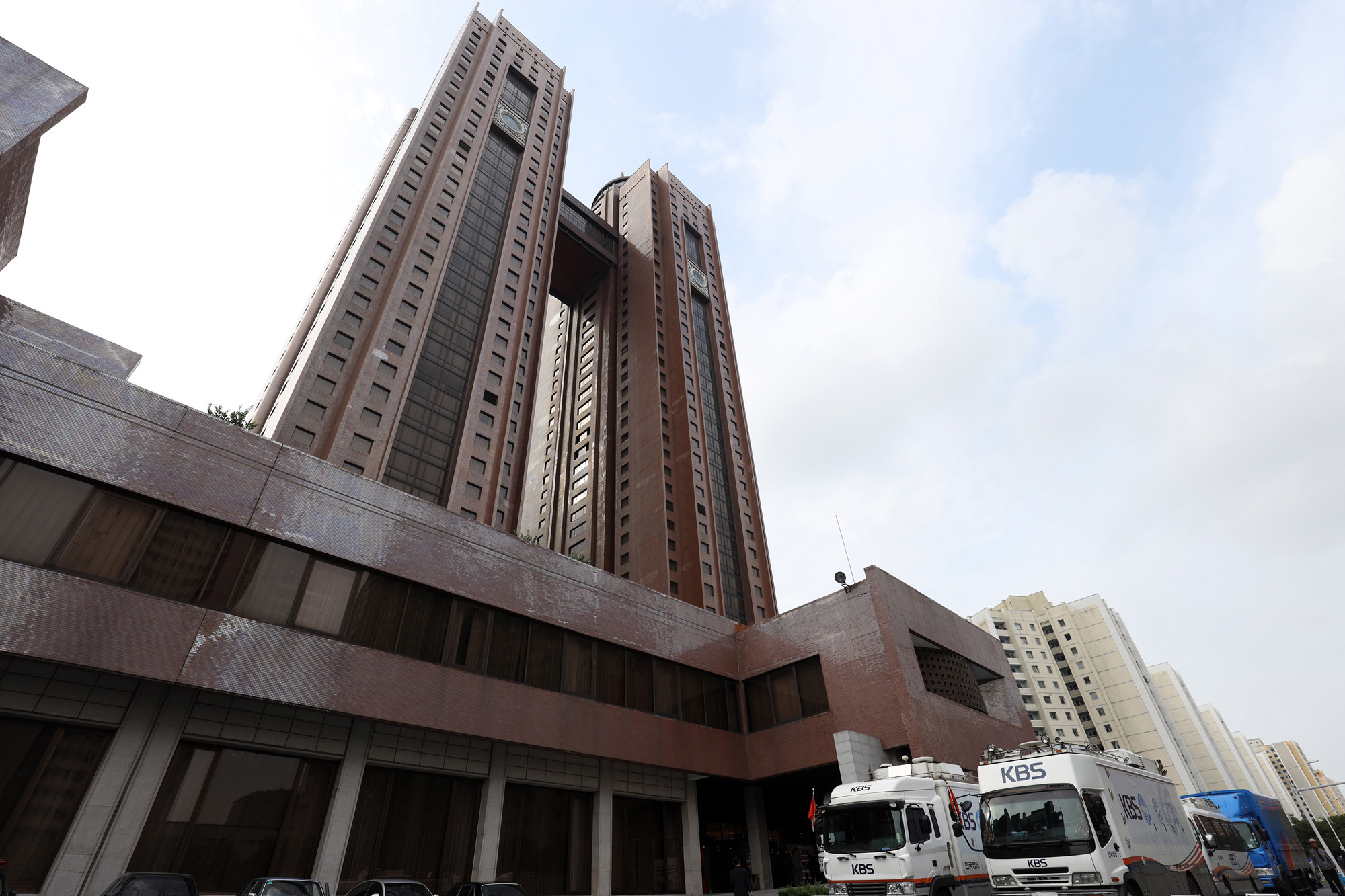 16일 오전 평양 고려호텔앞에 육로를 통해 올라온 KBS 중계차량이 놓여 있다. 2018.9.16 /평양사진공동취재단