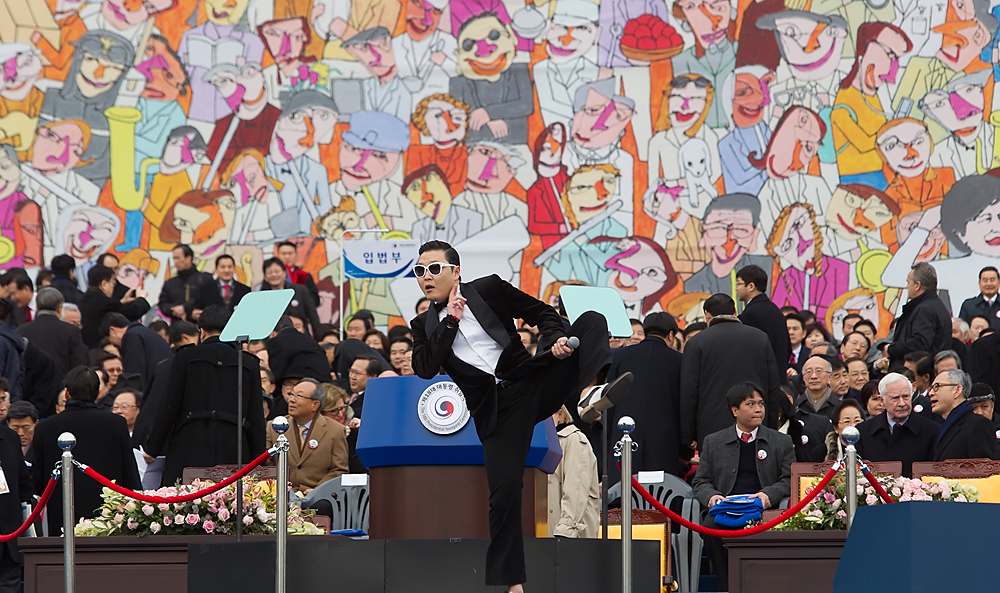 싸이가 25일 서울 영등포구 여의도동 국회의사당에서 열린 18대 대통령 취임식에서 축하공연을 하고 있다. 2013.02.25 사진 임준선 기자