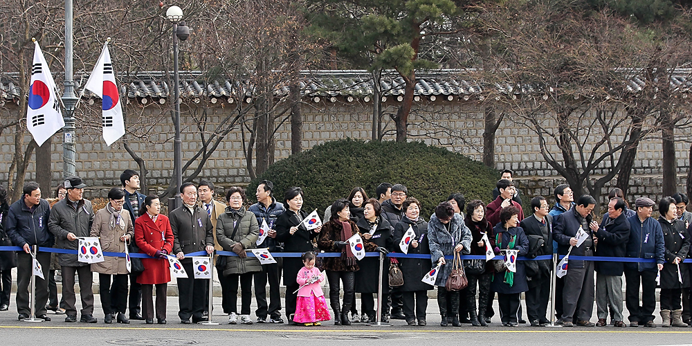 25일 오후 제18대 대통령 취임식을 마친 박근혜 대통령의 청와대 입성을 환영하기 위해 청와대 분수대 주변에 나온 주민들이 서 있다.