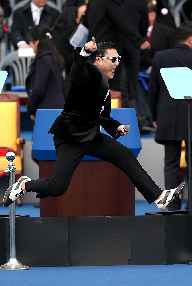 가수 싸이가 25일 서울 영등포구 여의도동 국회의사당에서 열린 18대 대통령 취임식에서 자신의 히트곡 '강남스타일'을 열창하고 있다. 2013.2.25/뉴스1