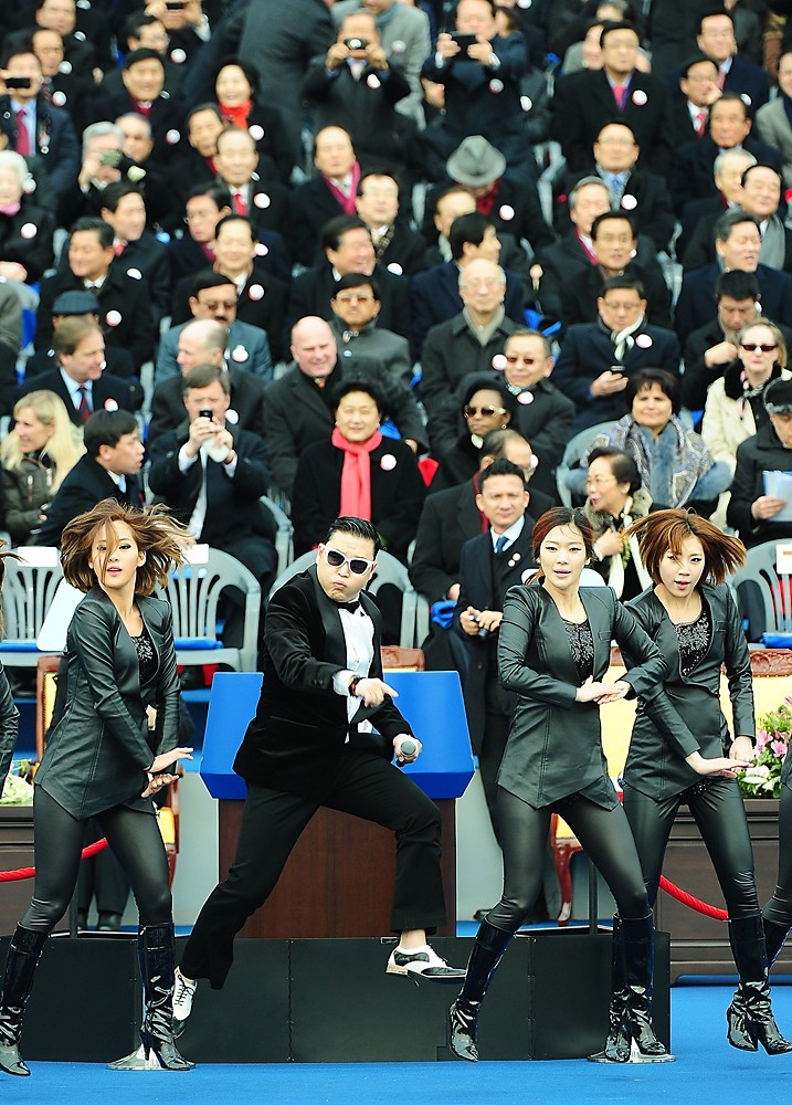 가수 싸이가 25일 오전 국회에서 열린 제18대 박근혜 대통령 취임식에서 말춤을 추고 있다./이병화 기자photolbh@