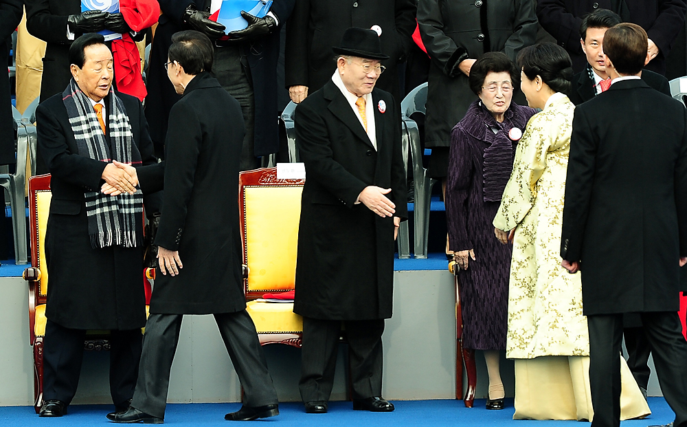 퇴임하는 이명박 전 대통령 내외가 25일 서울 여의도 국회의사당 광장에서 열린 18대 대통령 취임식에서 김영삼·전두환 전 대통령및 이희호 여사와 인사를 나누고 있다. 2013.2.25/뉴스1