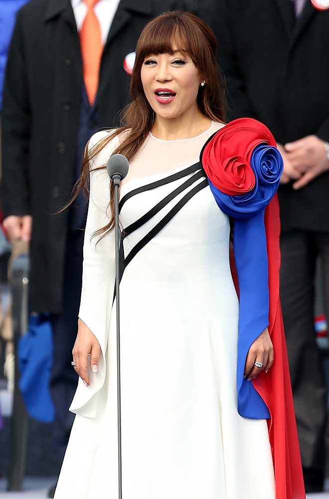 소프라노 조수미가 25일 서울 여의도 국회의사당 광장에서 열린 18대 대통령 취임식에서 태극기를 형상화한 디자인의 드레스를 입고 애국가를 부르고 있다. 2013.2.25/뉴스1