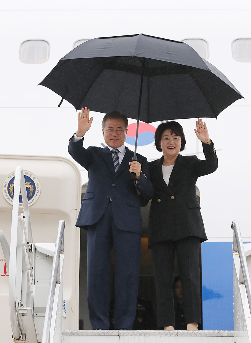 문재인 대통령과 부인 김정숙 여사가 제73차 유엔총회 참석차 23일(현지시간) 오후 미국 뉴욕 JFK 국제공항에 도착하고 있다.
