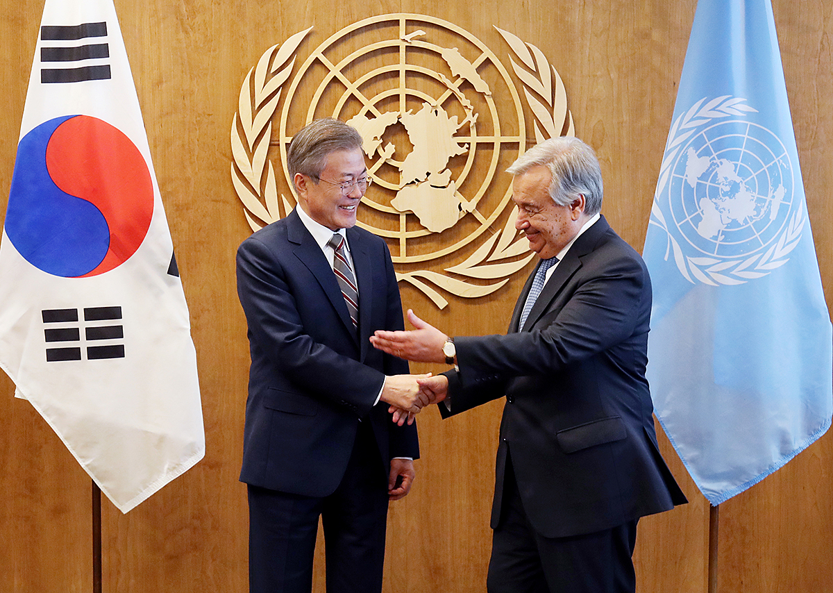 문재인 대통령이 24일 오후(현지시각) 미국 뉴욕 유엔본부에서 안토니우 구테흐스 유엔 사무총장 면담에서 악수를 하고 있다.