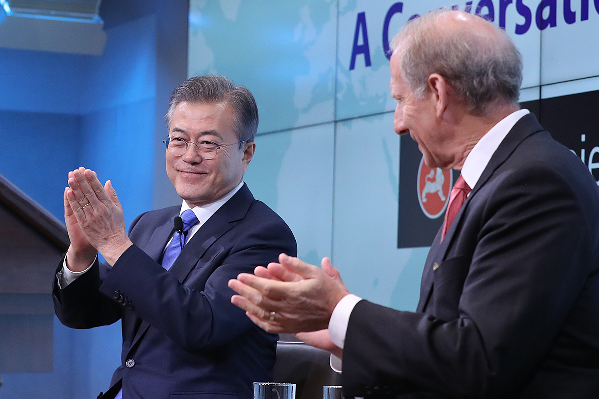 제73차 유엔총회 참석을 위해 뉴욕을 방문 중인 문재인 대통령이 25일 오후(현지시간) 미국 뉴욕 외교협회(CFR)에서 외교협회(CFR)·코리아 소사이어티(KS)·아시아 소사이어티(AS) 공동주최로 열린 “위대한 동맹으로 평화를(Our Greater Alliance, Making Peace(부제:문재인 대통령과의 대화, A Conversation with President Moon Jae-in)” 행사에 참석해 질문에 답하고 있다. 2018.09.25 사진 청와대제공 |