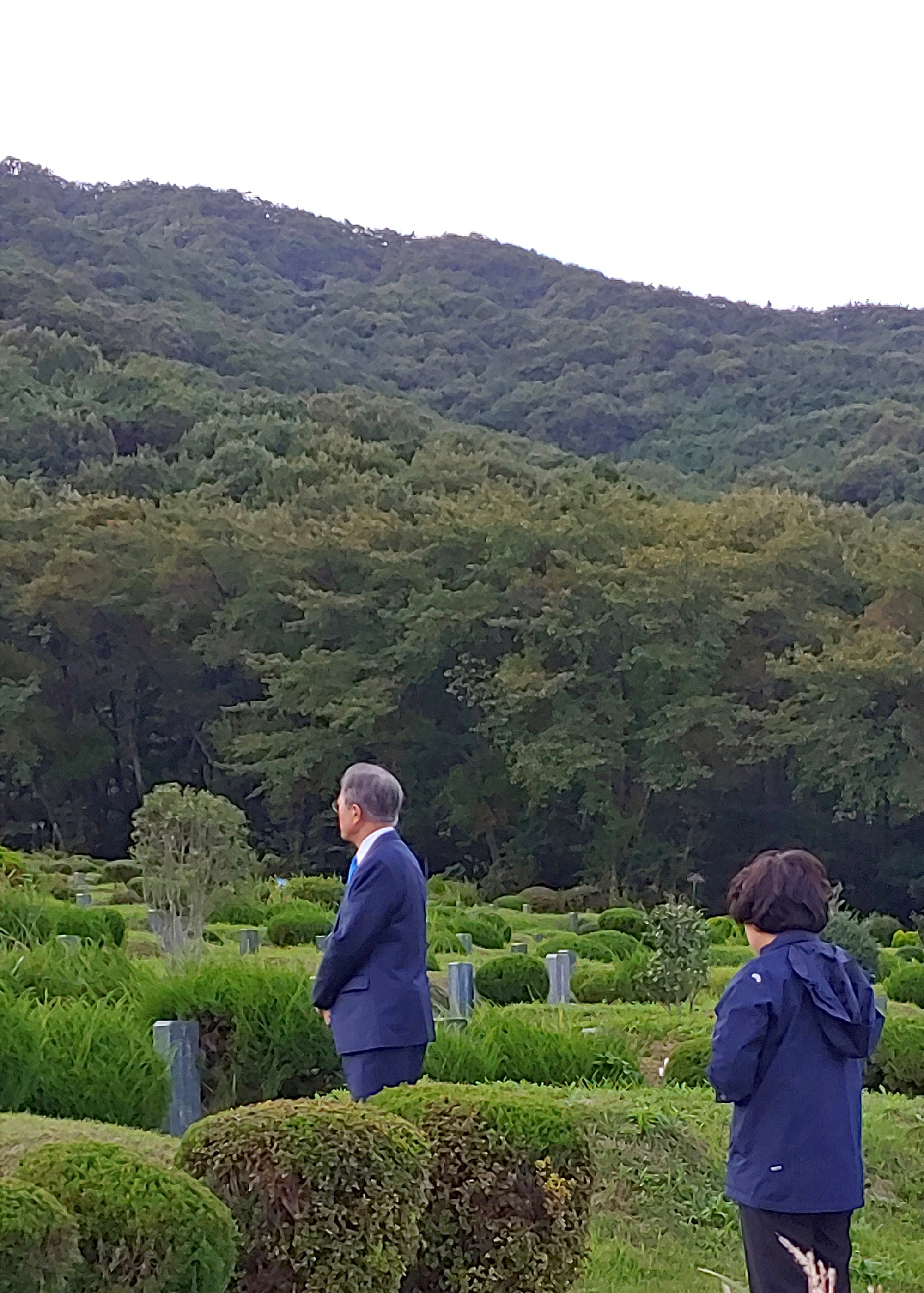 문재인 대통령과 부인 김정숙 여사가 28일 경남 양산시 천주교 하늘공원 묘지에 있는 선영을 찾아 참배하고 있다.