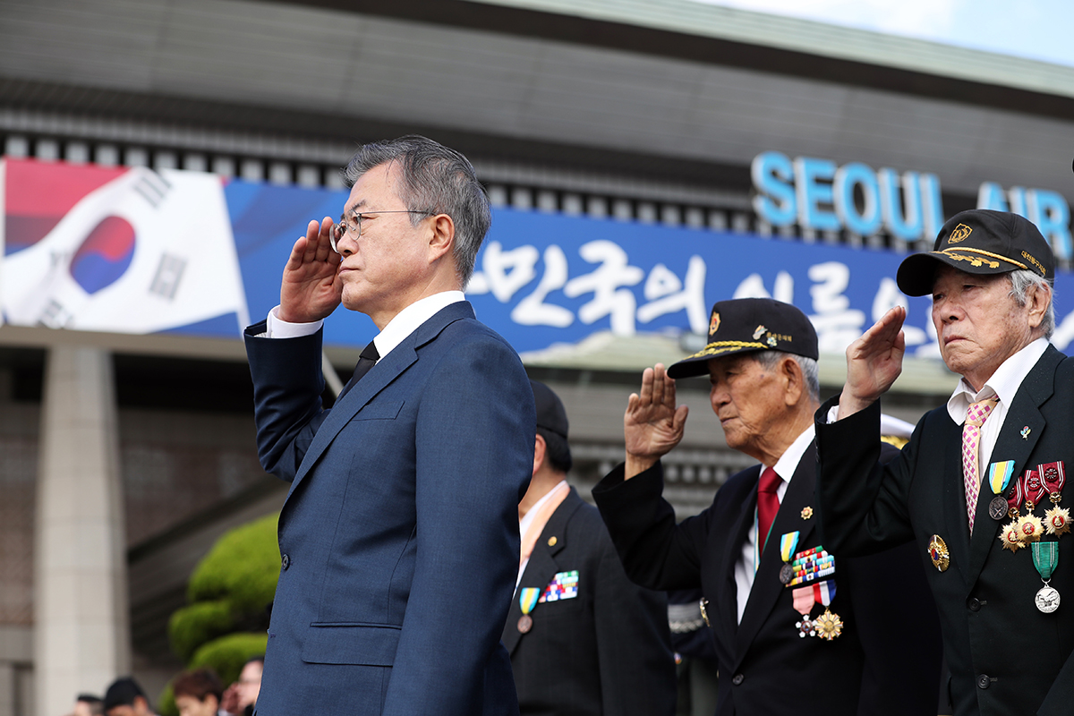문재인 대통령이 1일 경기 성남시 서울공항에서 열린 6·25전쟁 국군 전사자 유해 64위의 봉환 행사에 참석하고 있다.