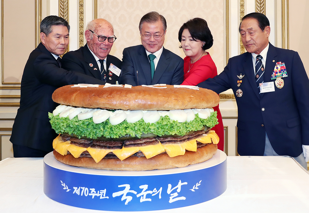문재인 대통령 내외가 1일 청와대 영빈관에서 열린 제70주년 국군의 날 경축연에서 대형 햄버거를 자르고 있다. 왼쪽부터 정경두 국방부 장관, 유엔군 참전 용사인 혹스워스 영국 예비역 육군하사, 문 대통령, 김정숙 여사, 김진호 재향군인회장