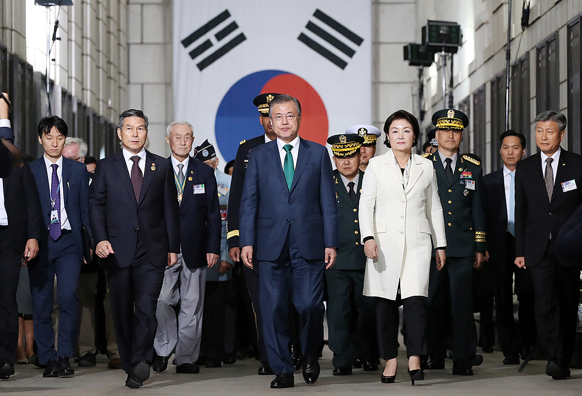 문재인 대통령과 김정숙 여사가 1일 오후 서울 용산 전쟁기념관 평화의 광장에서 열린 '제70주년 국군의 날 기념식'에 참석하고 있다.