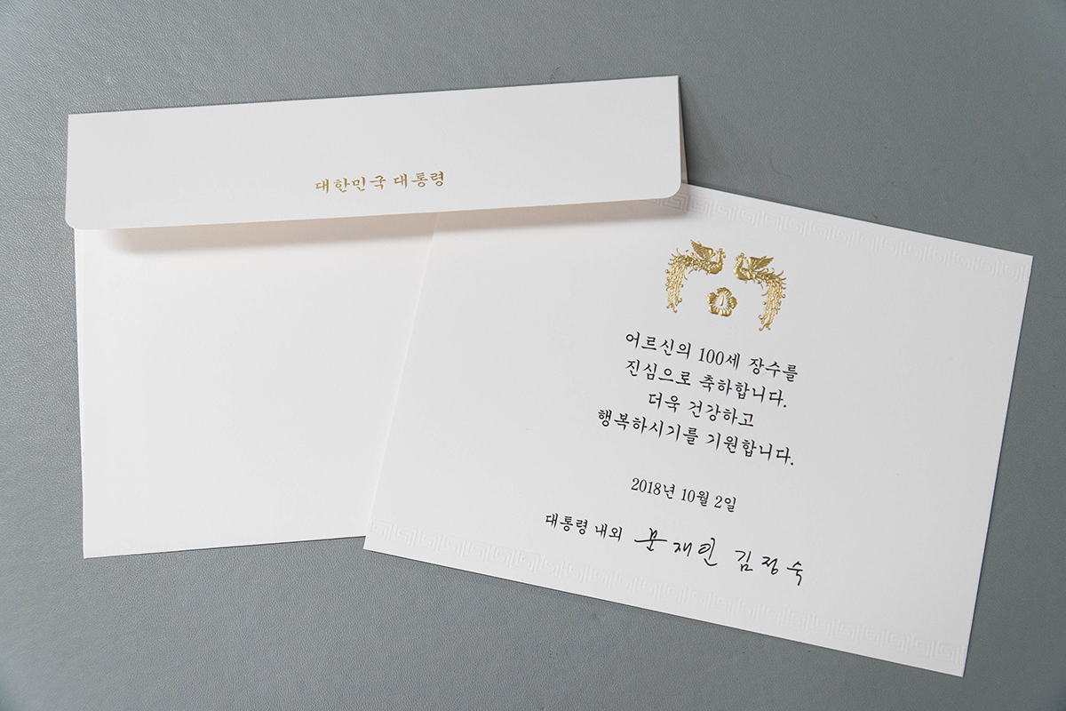 청와대는 2일 문재인 대통령 부부가 22회 노인의 날 기념식에 100세 어르신의 장수를 축하하며 보낸 카드 이미지를 공개했다.