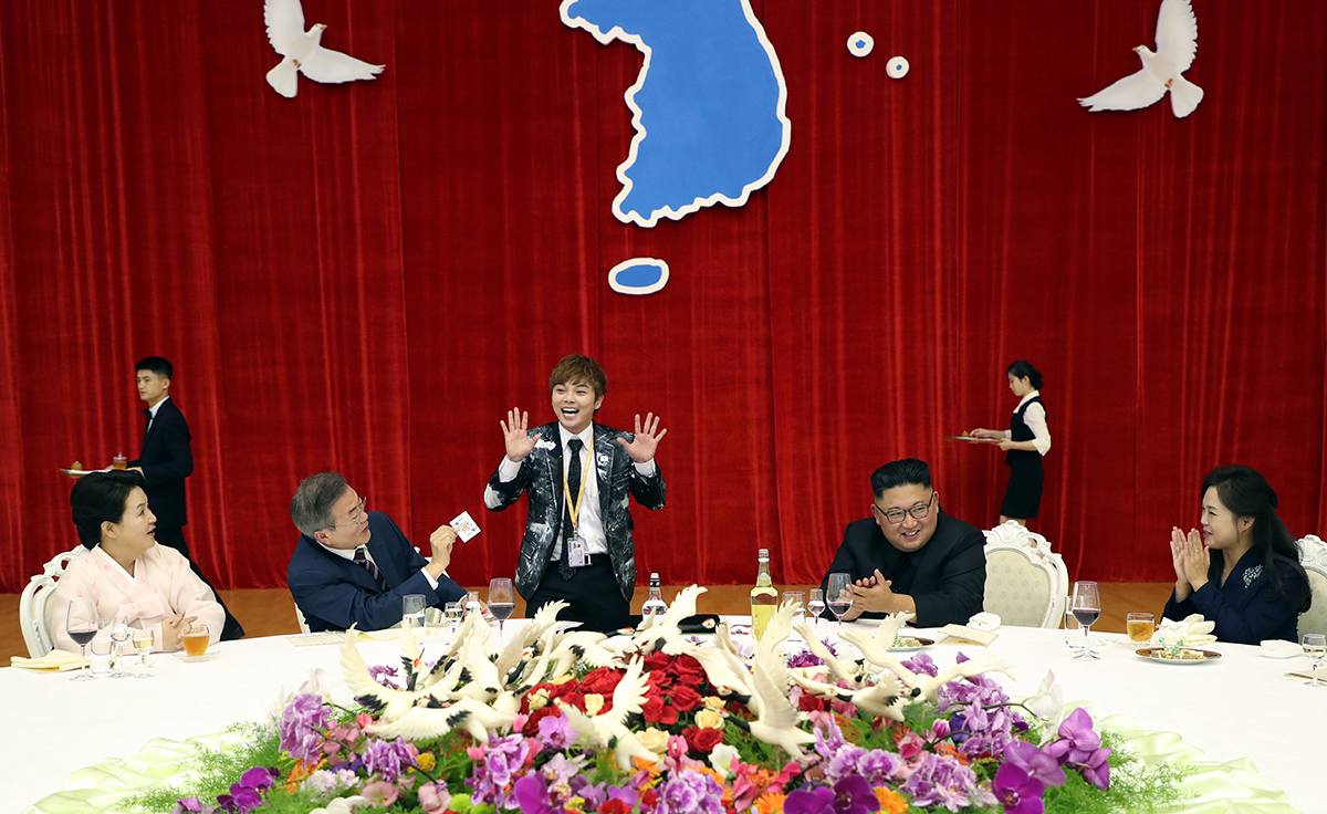 최현우 마술사는 문재인 대통령과 김정은 국무위원장이 '이심전심' 통한다는 텔레파시 마술을 선보였습니다. 북에서는 '교감 요술'이라고 한답니다. 서로 내심 떠올린 카드를 맞추고, 루빅스 큐브도 딱 맞췄습니다. 모든 카드가 한반도기로 변하는 마술도요