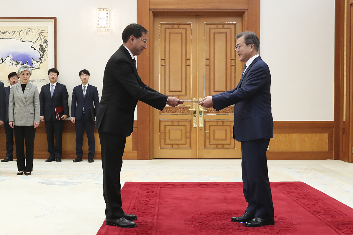 문재인 대통령이 8일 청와대 본관 접견실에서 열린 주한 대사 신임장 제정식에서 바큿 듀쎈바예프 주한 카자흐스탄대사로부터 신임장을 받고 있다.